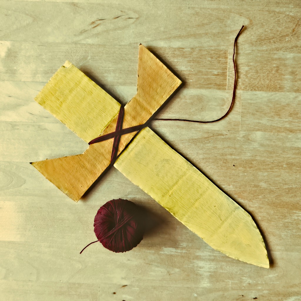 Až tempery zaschnou, slepte jílec a záštitu meče k sobě. Můžete je omotat bavlnkou, jako to vidíte na obrázku. Je to jen ozdoba, ale děti to bavilo.