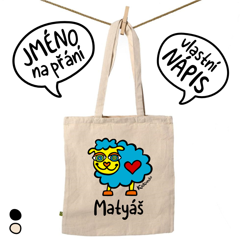 Poctivá bavlněná taška z vysokogramážové bio bavlny se jménem a s originálním motivem Kukando® ovečky – autorského obrázku, který jinde nenajdete :-)