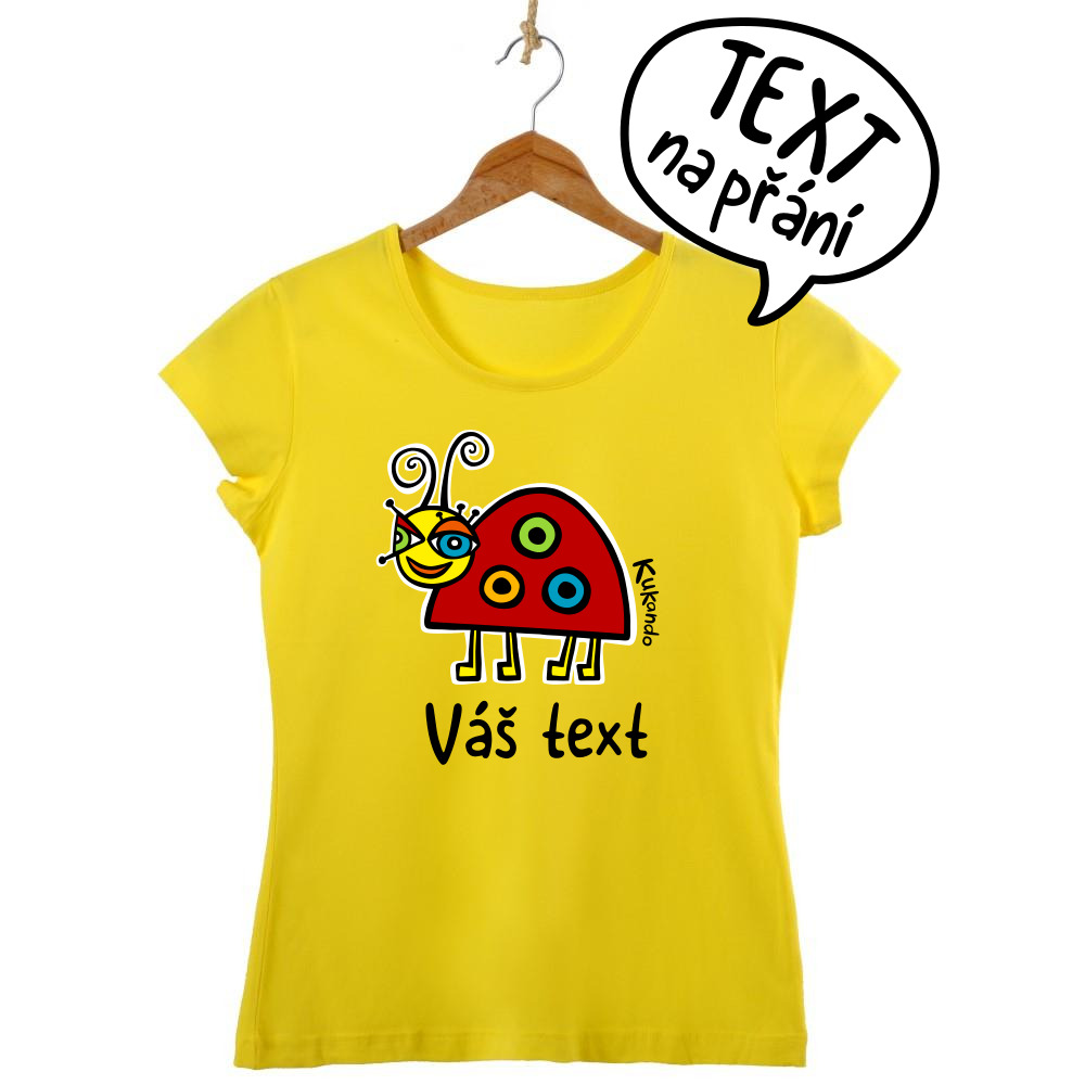 Veselé dámské tričko s vlastním nápisem a s motivem Kukando® berušky – autorského obrázku, který jinde nenajdete :-)