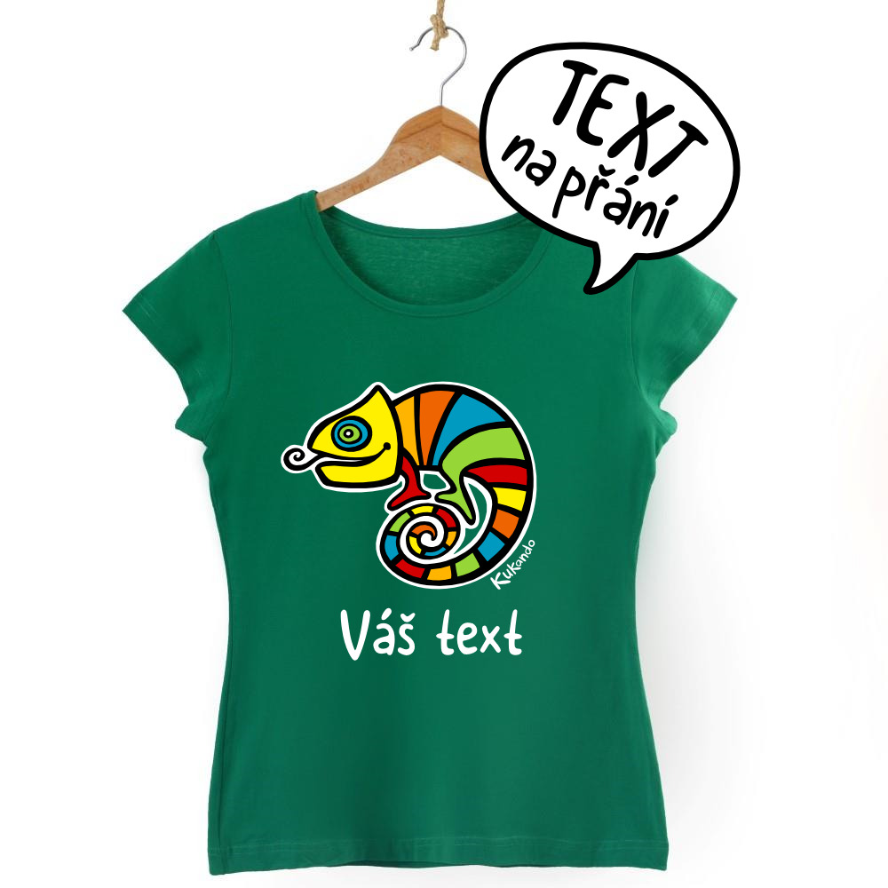 Veselé dámské tričko s vlastním nápisem a s motivem Kukando® chameleona – autorského obrázku, který jinde nenajdete :-)