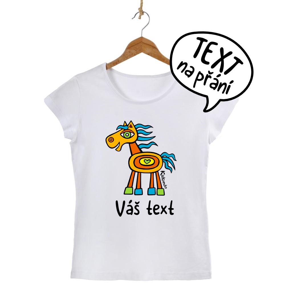 Veselé dámské tričko s vlastním nápisem a s motivem Kukando® koníka – autorského obrázku, který jinde nenajdete :-)