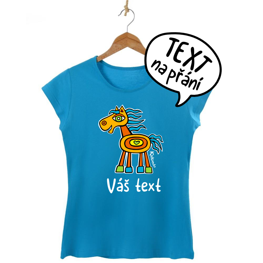 Veselé dámské tričko s vlastním nápisem a s motivem Kukando® koníka – autorského obrázku, který jinde nenajdete :-)