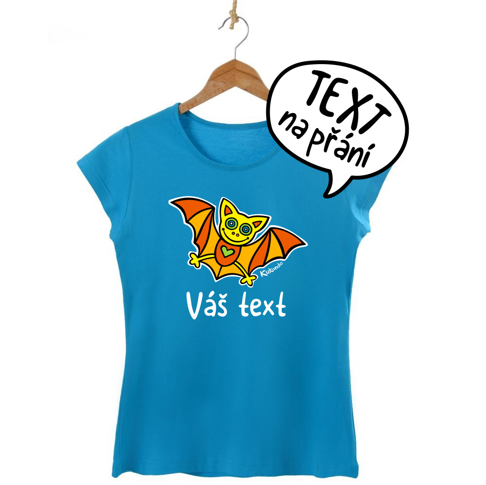Veselé dámské tričko s vlastním nápisem a s motivem Kukando® netopýra – autorského obrázku, který jinde nenajdete :-)