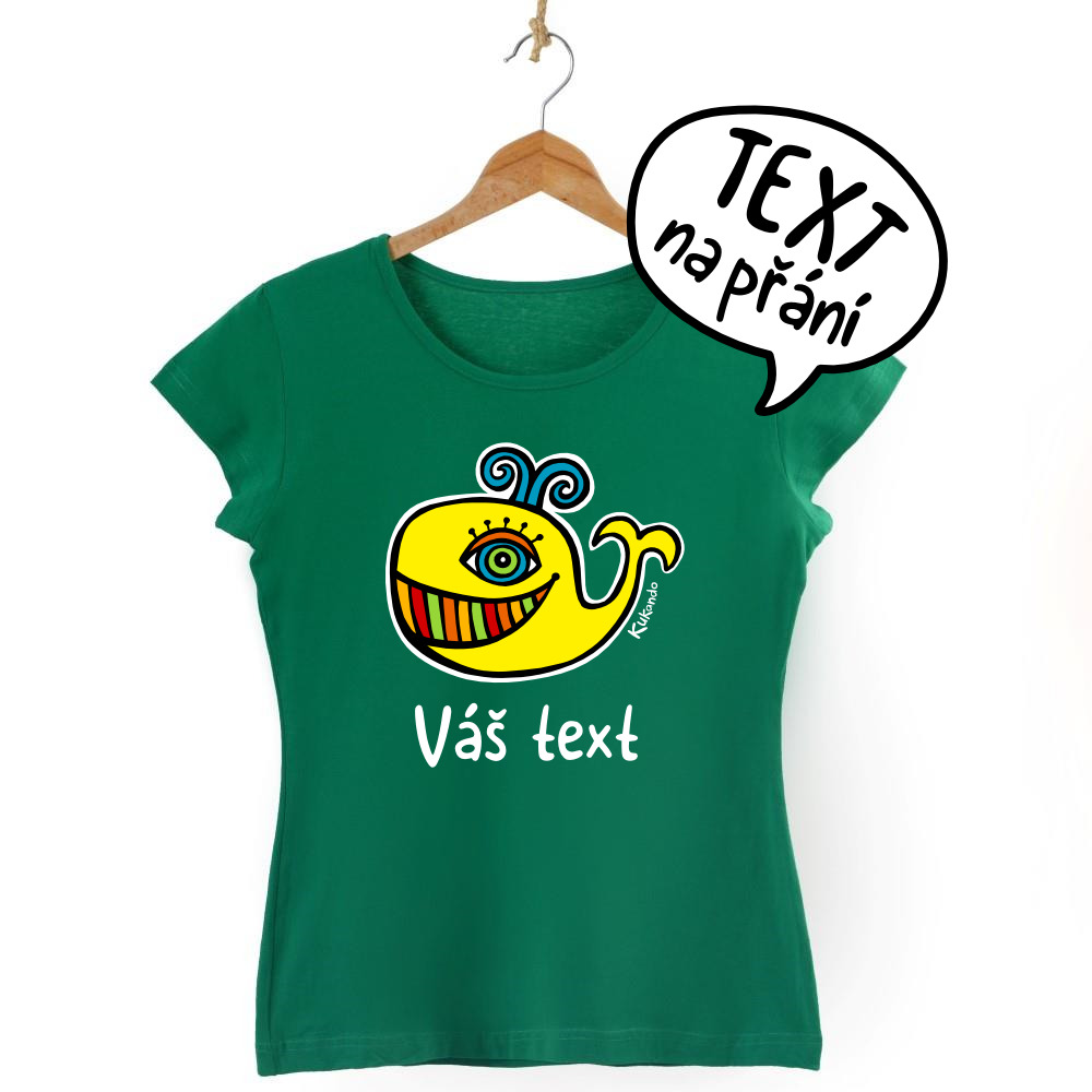 Veselé dámské tričko s vlastním nápisem a s motivem Kukando® velryby – autorského obrázku, který jinde nenajdete :-)