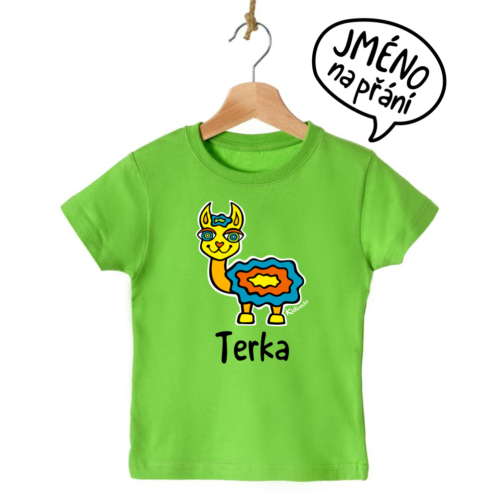 Veselé dětské tričko se jménem a s motivem Kukando® lamy – autorského obrázku, který jinde nenajdete :-)