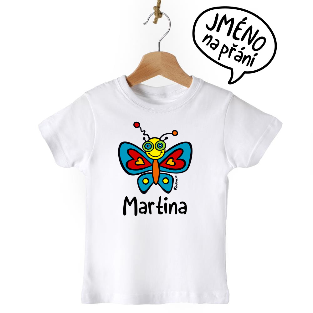 Veselé dětské tričko se jménem a s motivem Kukando® motýla – autorského obrázku, který jinde nenajdete :-)