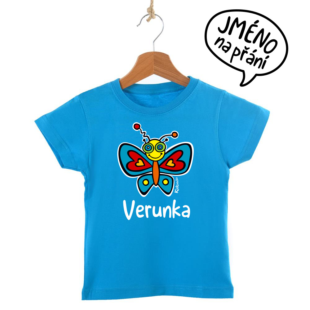 Veselé dětské tričko se jménem a s motivem Kukando® motýla – autorského obrázku, který jinde nenajdete :-)
