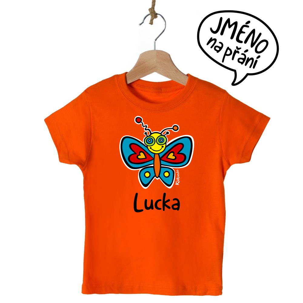 Veselé dětské tričko se jménem a s motivem Kukando® motýla – autorského obrázku, který jinde nenajdete :-)