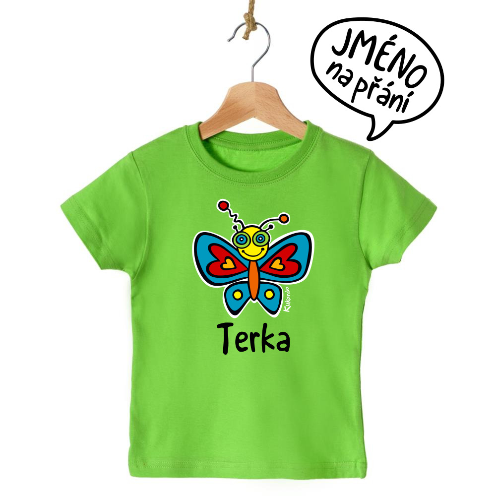 Veselé dětské tričko se jménem a s motivem Kukando® motýla – autorského obrázku, který jinde nenajdete :-)