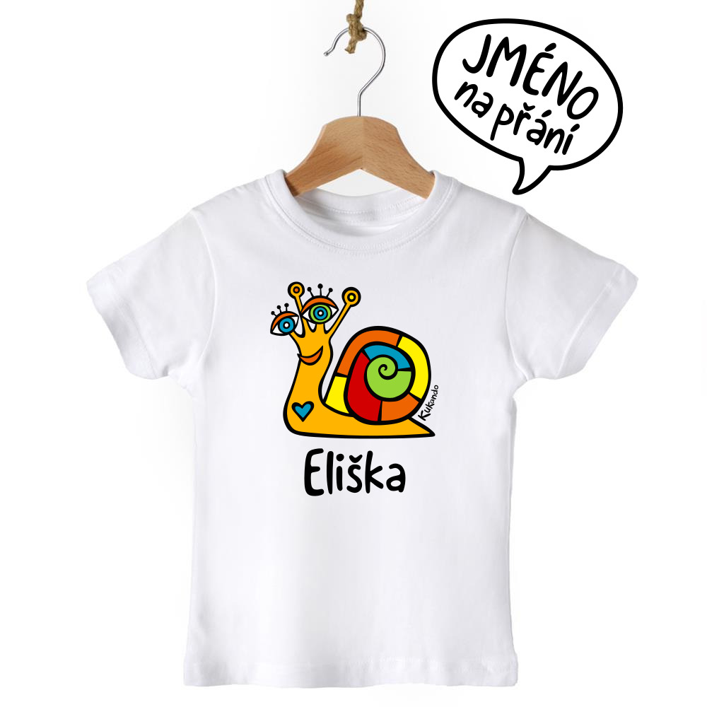 Veselé dětské tričko se jménem a s motivem Kukando® šneka – autorského obrázku, který jinde nenajdete :-)