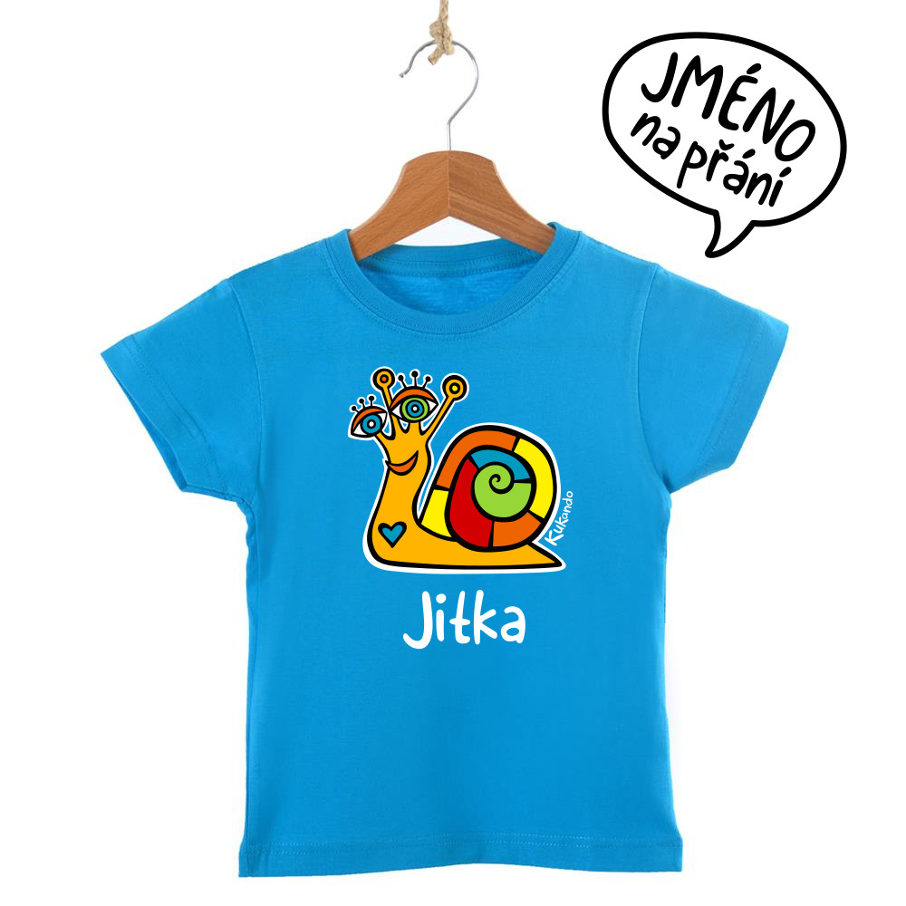 Veselé dětské tričko se jménem a s motivem Kukando® šneka – autorského obrázku, který jinde nenajdete :-)