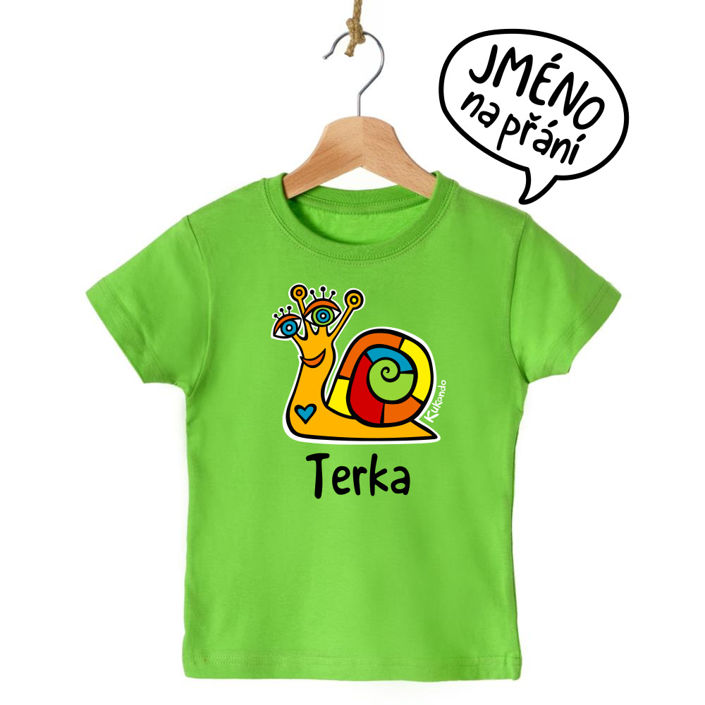 Veselé dětské tričko se jménem a s motivem Kukando® šneka – autorského obrázku, který jinde nenajdete :-)