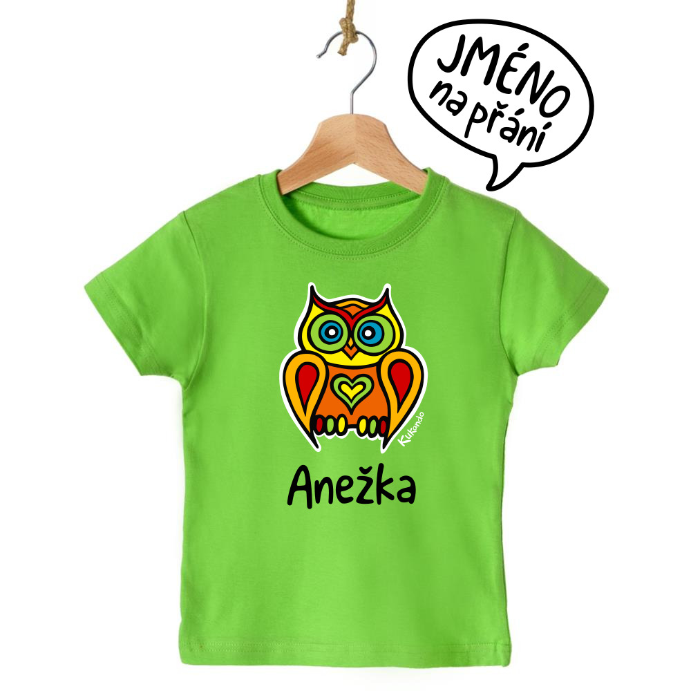 Veselé dětské tričko se jménem a s motivem Kukando® sovy – autorského obrázku, který jinde nenajdete :-)