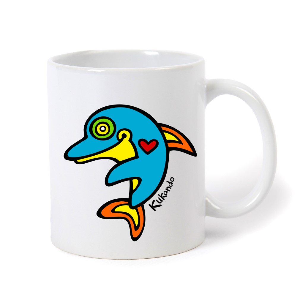 Veselý keramický hrnek s oboustranným potiskem Kukando delfína – autorského obrázku, který jinde nenajdete :-)