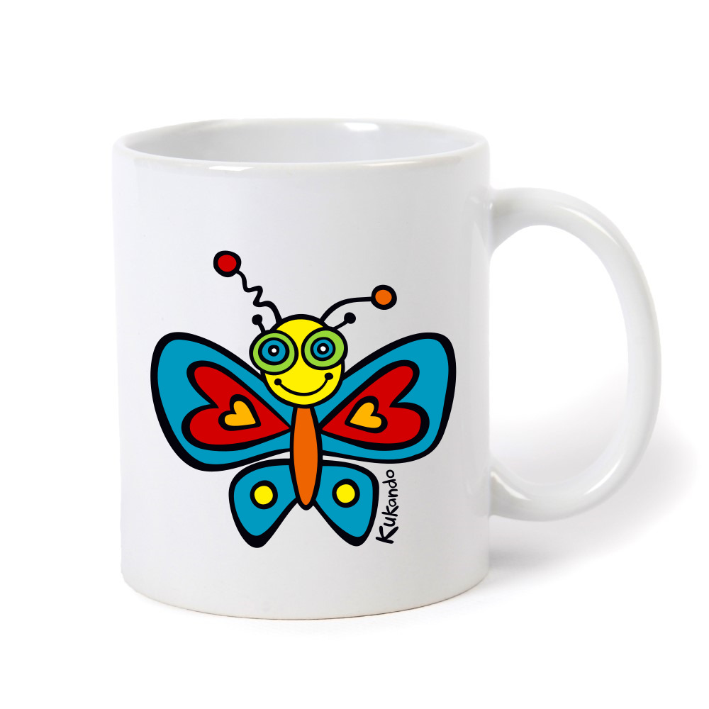Veselý keramický hrnek s oboustranným motivem Kukando® motýla – autorského obrázku, který jinde nenajdete :-)