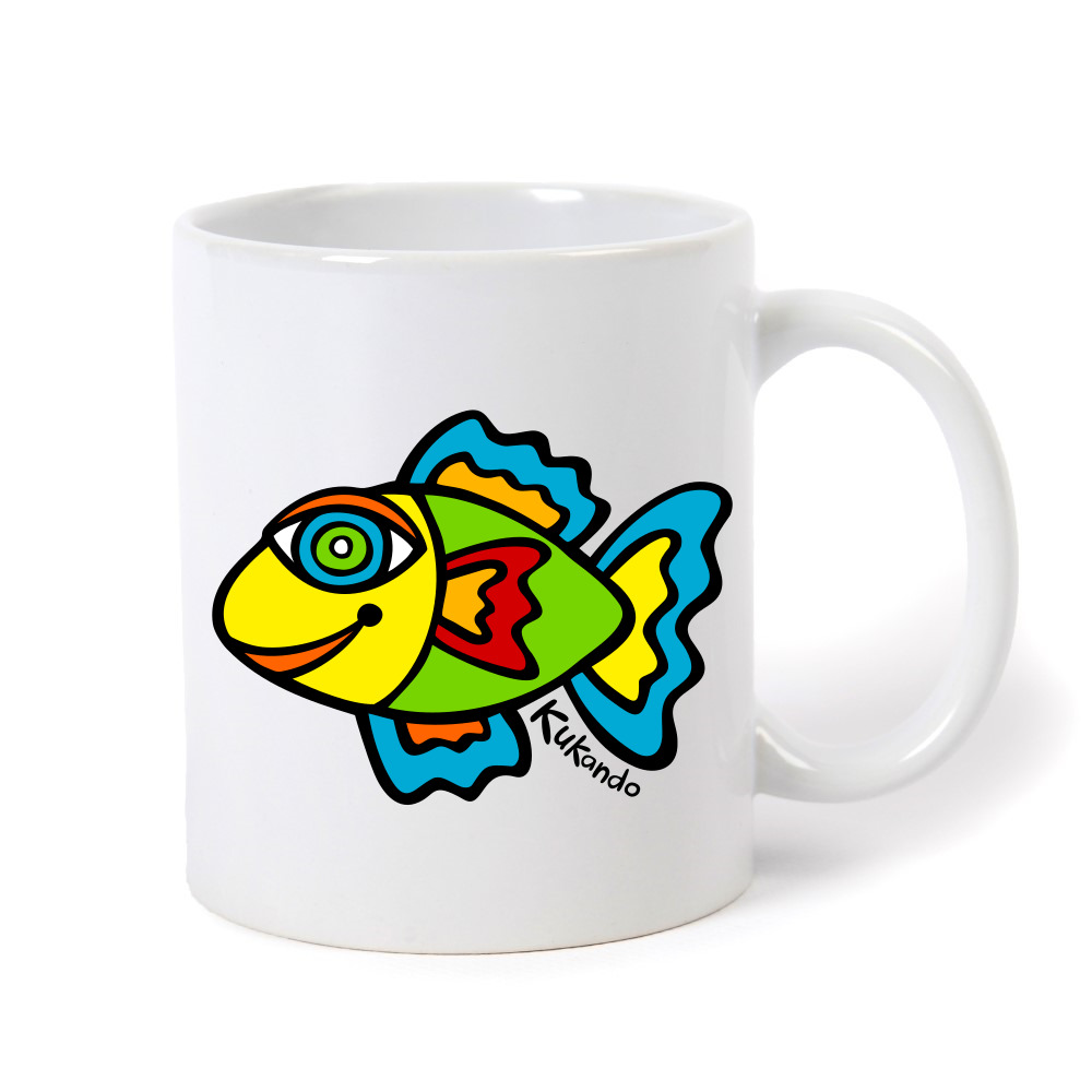Veselý keramický hrnek s oboustranným potiskem Kukando rybičky – autorského obrázku, který jinde nenajdete :-)
