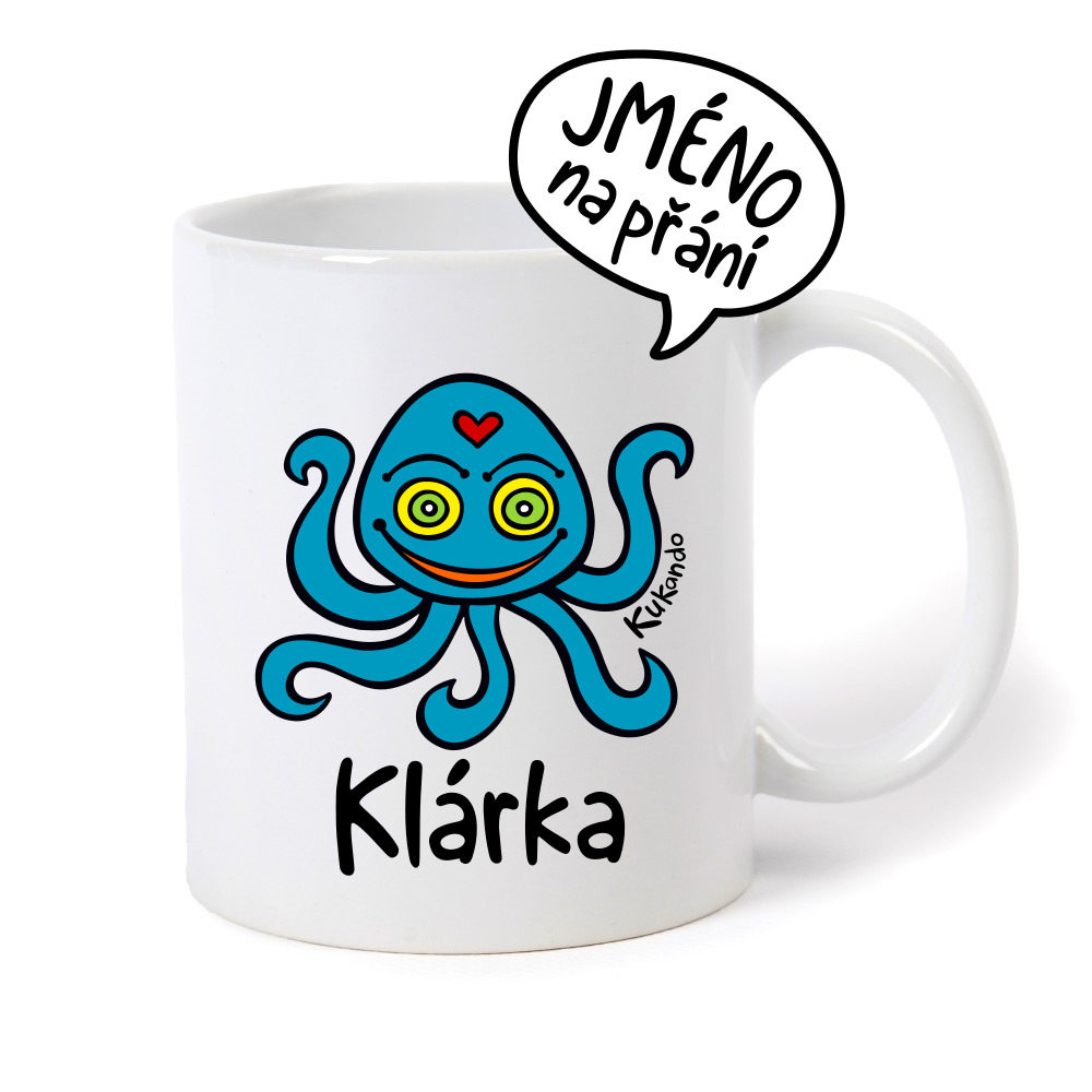 Veselý keramický hrnek se jménem a s oboustranným potiskem Kukando® chobotnice – autorského obrázku, který jinde nenajdete :-)