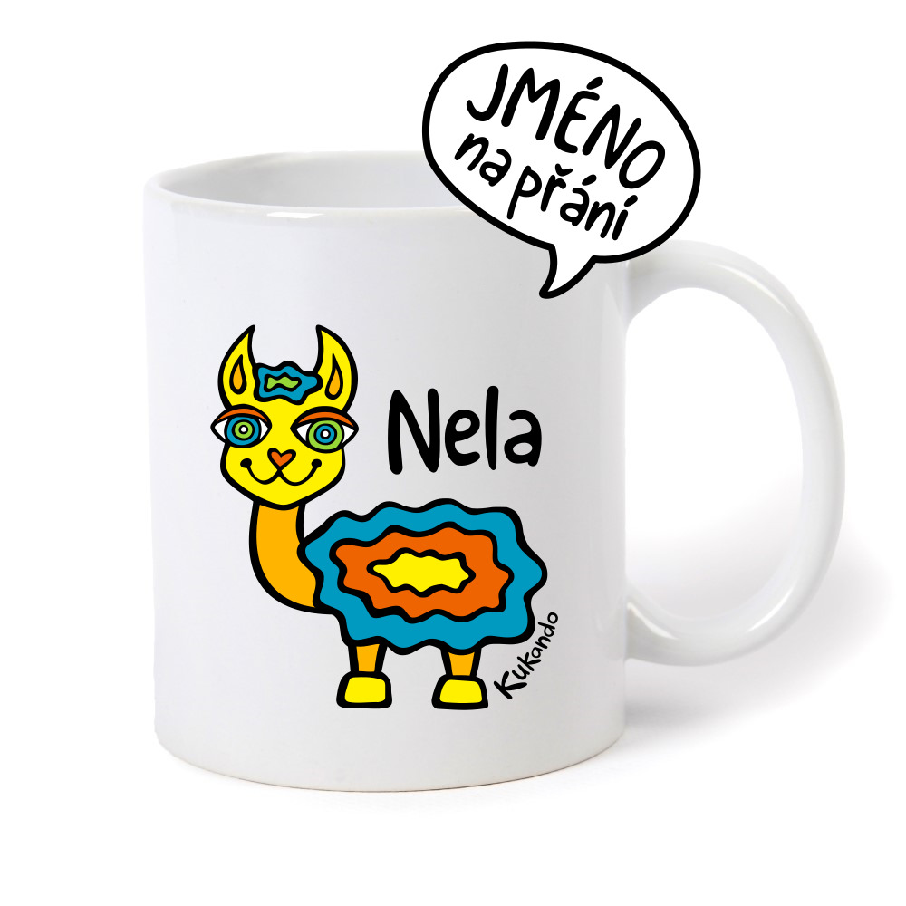 Veselý keramický hrnek se jménem a s oboustranným potiskem Kukando® lamy – autorského obrázku, který jinde nenajdete :-)