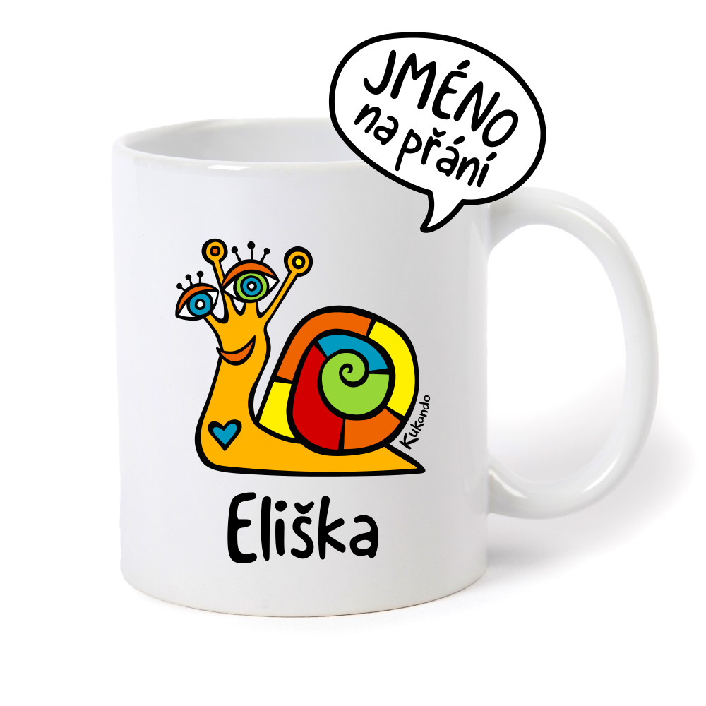 Veselý keramický hrnek se jménem a s oboustranným potiskem Kukando® šneka – autorského obrázku, který jinde nenajdete :-)