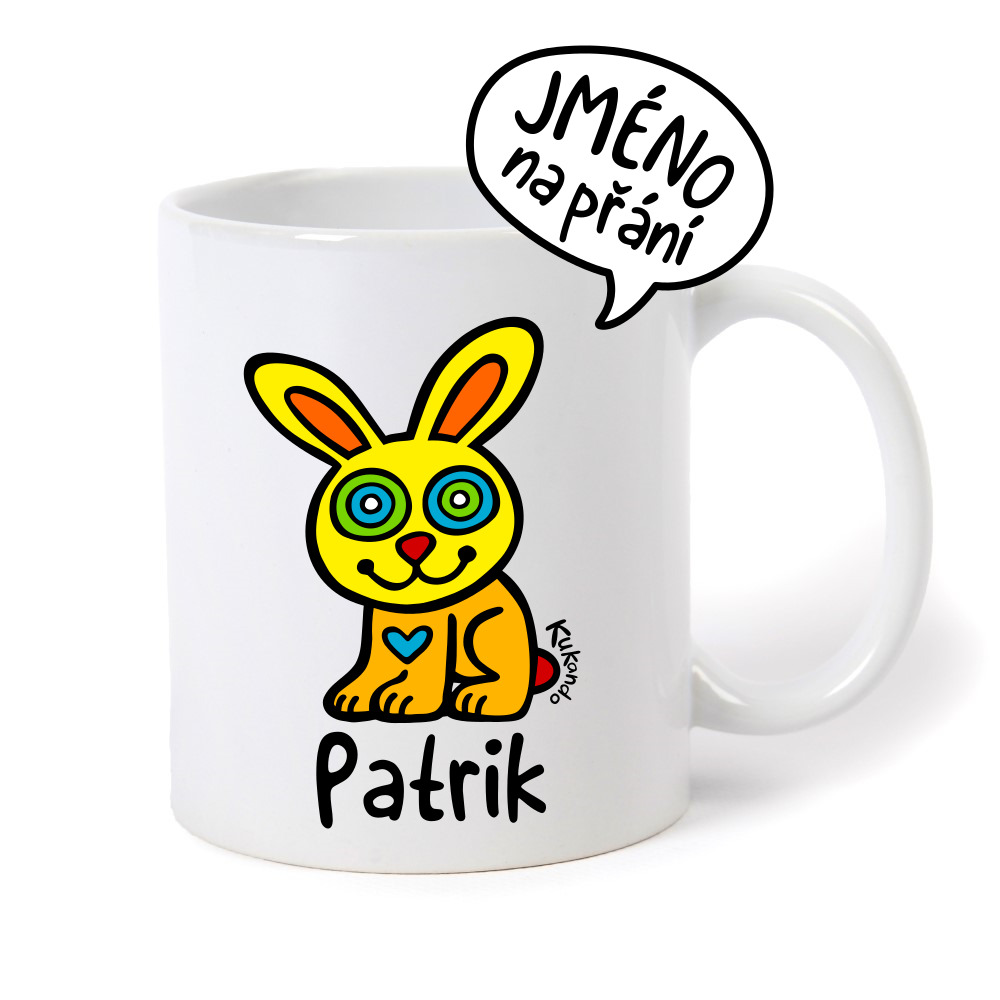 Veselý keramický hrnek se jménem a s oboustranným potiskem Kukando zajíčka – autorského obrázku, který jinde nenajdete :-)