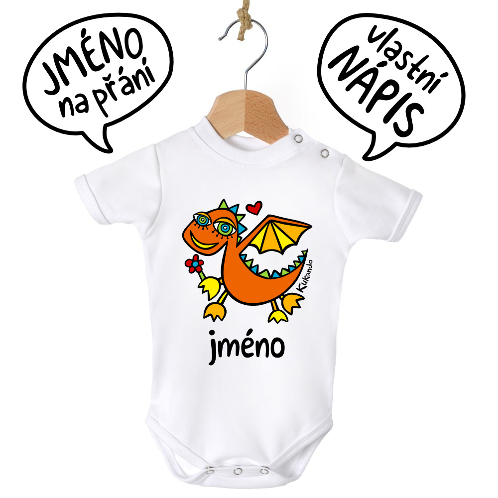 Veselé kojenecké body se jménem a s potiskem Kukando® dráčka – autorského obrázku, který jinde nenajdete :-) Bodýčko je vyrobené v České republice z látek od českých výrobců.
