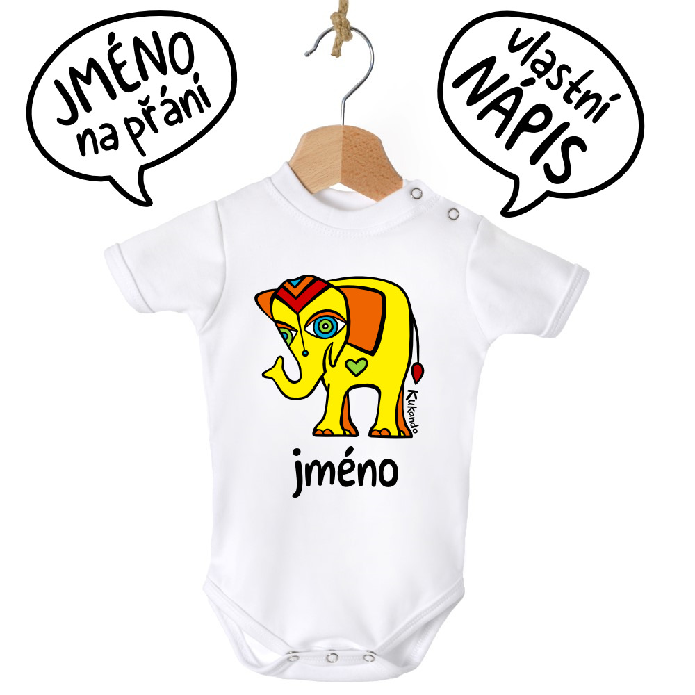Veselé kojenecké body se jménem a s potiskem Kukando® slona – autorského obrázku, který jinde nenajdete :-) Bodýčko je vyrobené v České republice z látek od českých výrobců.