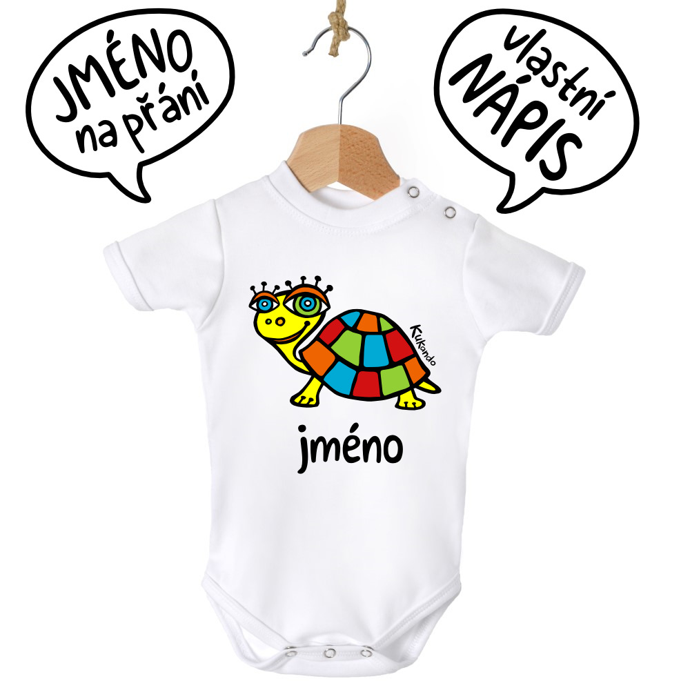 Veselé kojenecké body se jménem a s potiskem Kukando® želvy – autorského obrázku, který jinde nenajdete :-) Bodýčko je vyrobené v České republice z látek od českých výrobců.