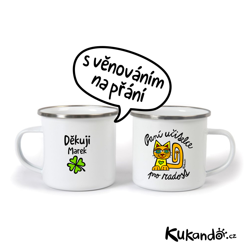 Veselý dárkový Kukando® plecháček pro učitelku či učitele. Plecháček je lehký a téměř nerozbitný hrneček, ze kterého si můžete pochutnat na čaji, kafíčku nebo třeba horké čokoládě.