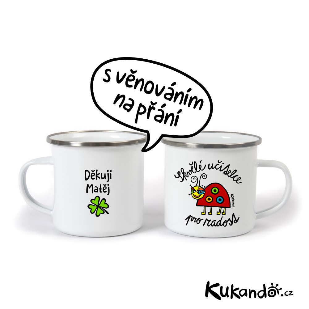 Veselý dárkový Kukando® plecháček pro učitelku či učitele. Plecháček je lehký a téměř nerozbitný hrneček, ze kterého si můžete pochutnat na čaji, kafíčku nebo třeba horké čokoládě.