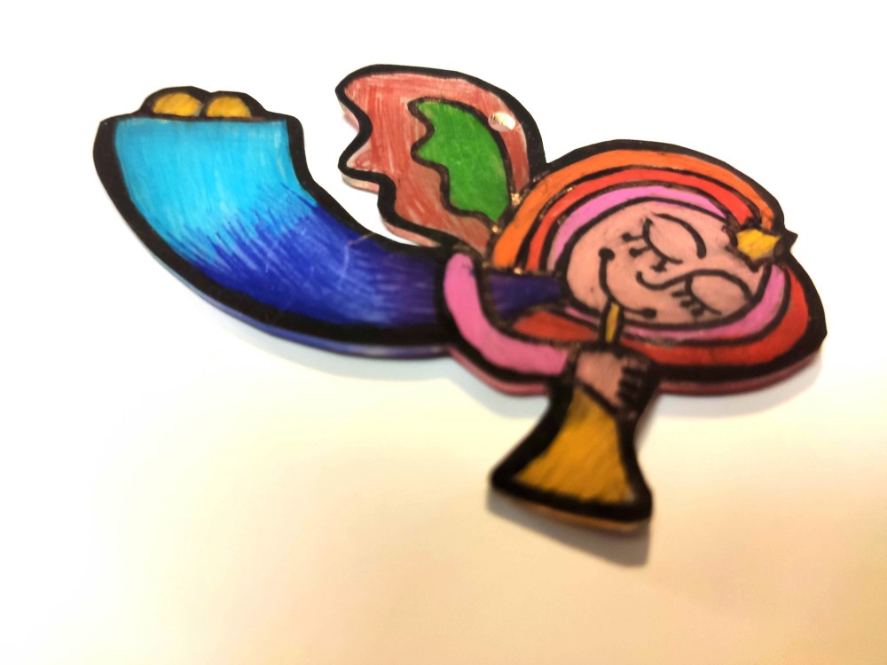 - Jakmile se přívěsek přestane kroutit a zmenšování ustane, vyndejte ho z trouby a ještě teplý ho případně lehce přitiskněte, aby byl úplně rovný.