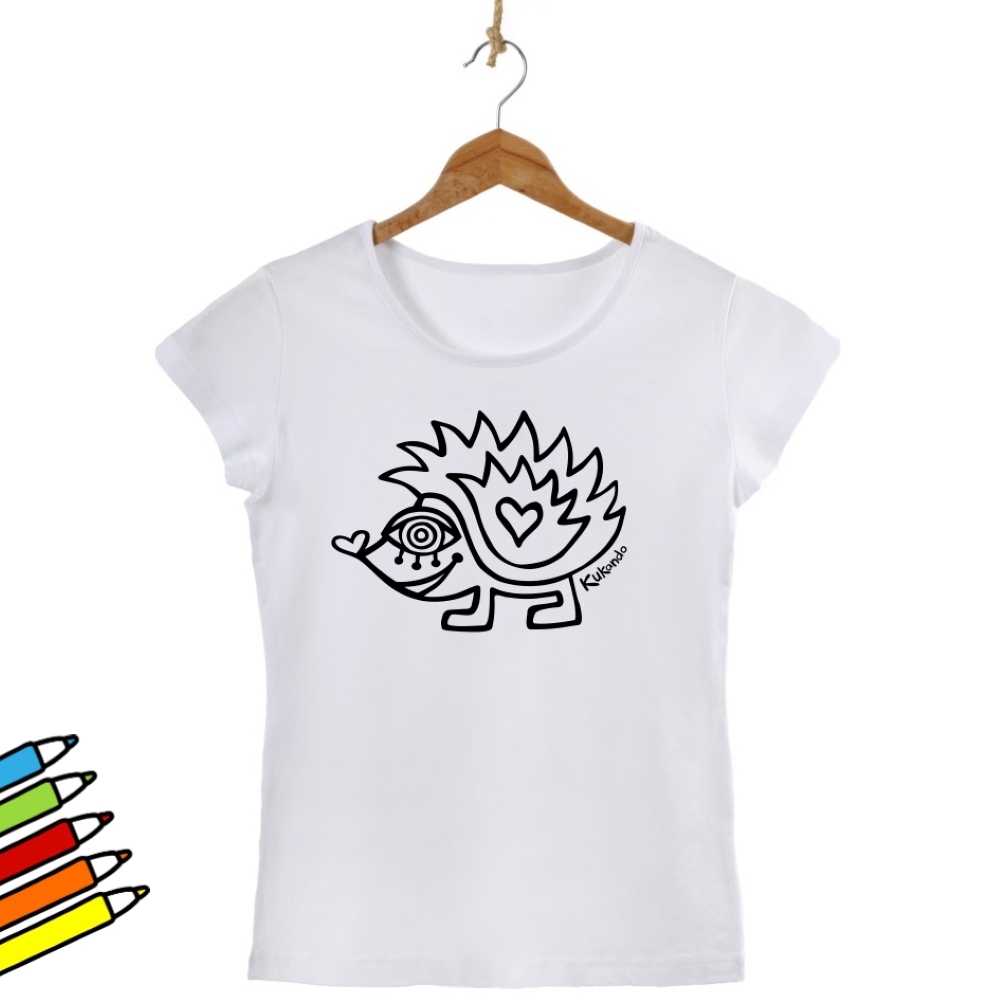 Veselé dámské tričko s motivem Kukando ježka – autorského obrázku, který jinde nenajdete :-) Popusťte uzdu své fantazii a udělejte z trička s pomocí fixů na textil skutečný originál!
