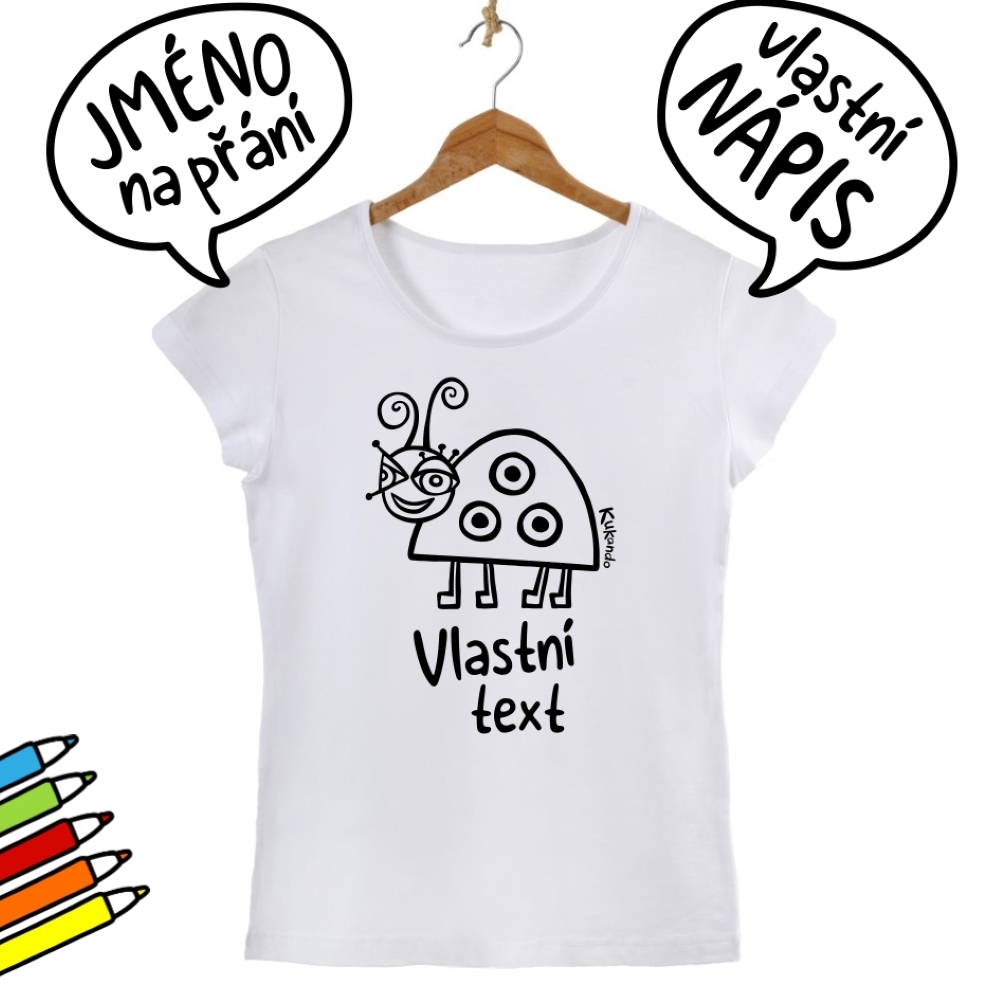 Veselé dámské tričko s textem na přání a s potiskem Kukando berušky – autorského obrázku, který jinde nenajdete :-) Popusťte uzdu své fantazii a udělejte z trička s pomocí fixů na textil skutečný originál!