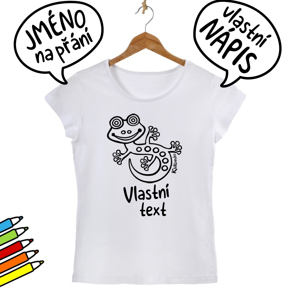 Veselé dámské tričko s textem na přání a s potiskem Kukando ještěrky – autorského obrázku, který jinde nenajdete :-) Popusťte uzdu své fantazii a udělejte z trička s pomocí fixů na textil skutečný originál!