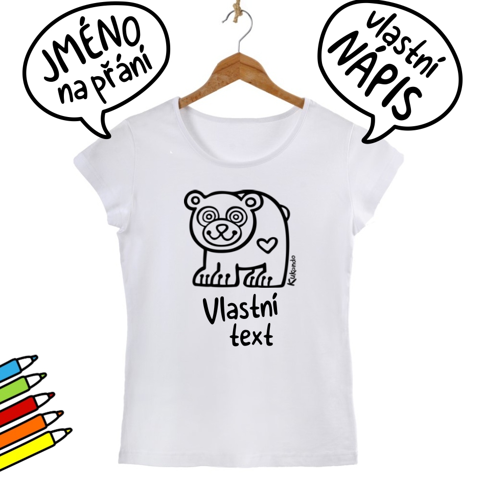 Veselé dámské tričko s textem na přání a s potiskem Kukando medvěda – autorského obrázku, který jinde nenajdete :-) Popusťte uzdu své fantazii a udělejte z trička s pomocí fixů na textil skutečný originál!