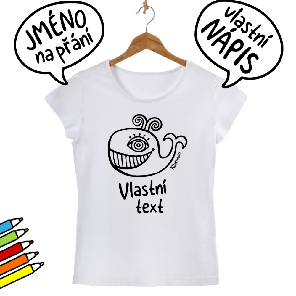 Veselé dámské tričko s textem na přání a s potiskem Kukando velryby – autorského obrázku, který jinde nenajdete :-) Popusťte uzdu své fantazii a udělejte z trička s pomocí fixů na textil skutečný originál!