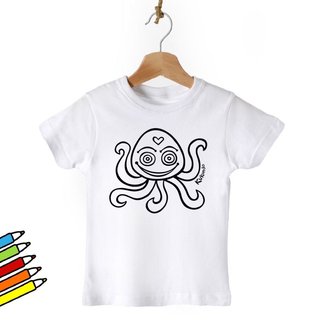 Vybarvovací dětské tričko s motivem Kukando chobotnice – autorského obrázku, který jinde nenajdete :-) Popusťte uzdu své fantazii a udělejte z trička s pomocí fixů na textil skutečný originál!