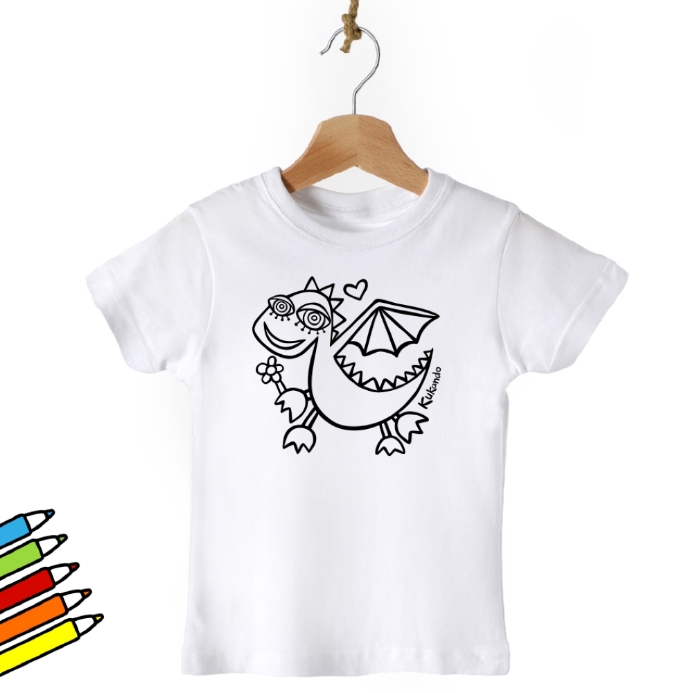 Vybarvovací dětské tričko s motivem Kukando dráčka – autorského obrázku, který jinde nenajdete :-) Popusťte uzdu své fantazii a udělejte z trička s pomocí fixů na textil skutečný originál!