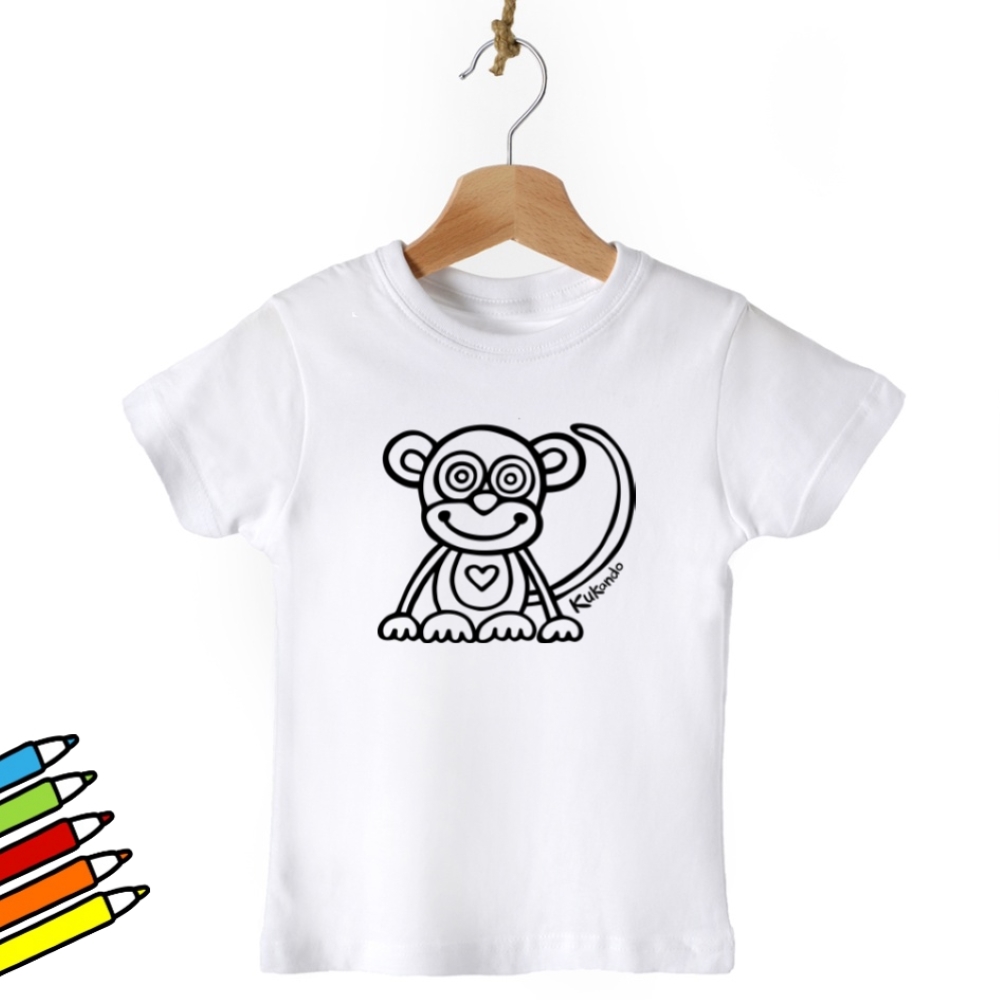 Vybarvovací dětské tričko s motivem Kukando opičky – autorského obrázku, který jinde nenajdete :-) Popusťte uzdu své fantazii a udělejte z trička s pomocí fixů na textil skutečný originál!