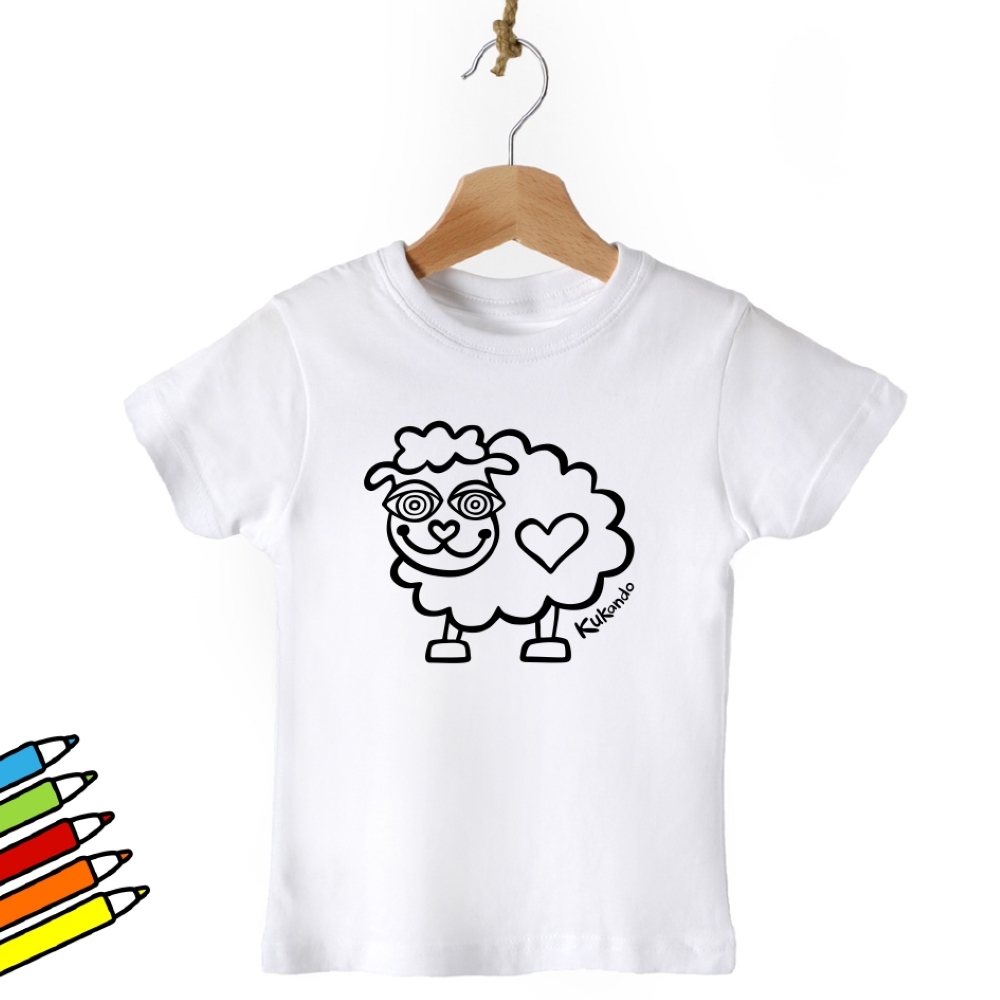 Vybarvovací dětské tričko s motivem Kukando ovečky – autorského obrázku, který jinde nenajdete :-) Popusťte uzdu své fantazii a udělejte z trička s pomocí fixů na textil skutečný originál!