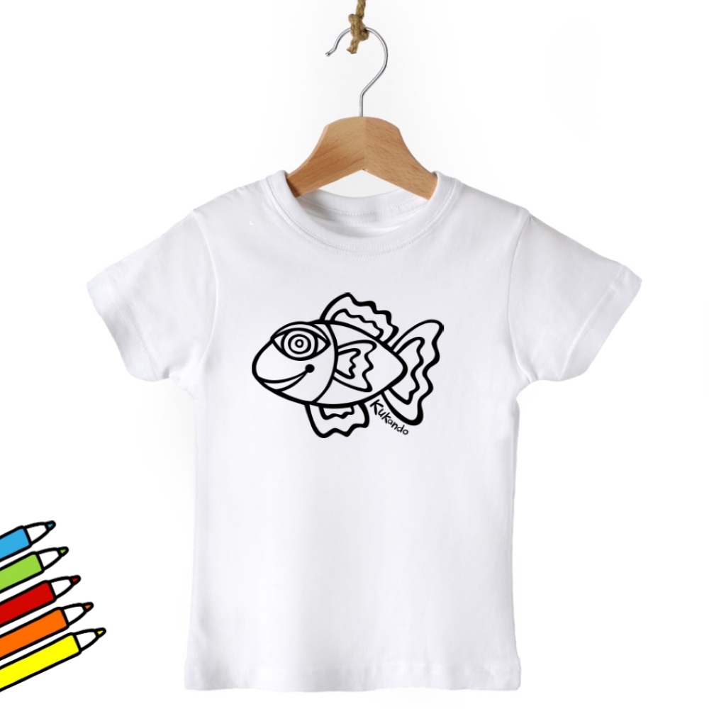 Vybarvovací dětské tričko s motivem Kukando rybičky – autorského obrázku, který jinde nenajdete :-) Popusťte uzdu své fantazii a udělejte z trička s pomocí fixů na textil skutečný originál!