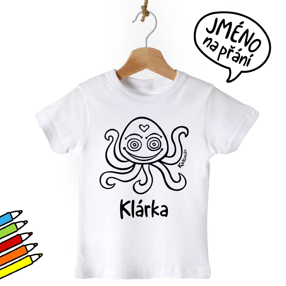 Vybarvovací dětské tričko se jménem a s motivem Kukando chobotnice – autorského obrázku, který jinde nenajdete :-) Popusťte uzdu své fantazii a udělejte z trička s pomocí fixů na textil skutečný originál!