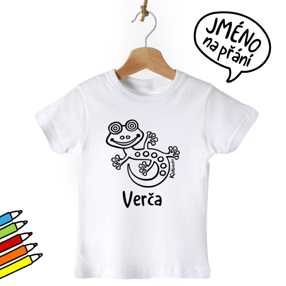 Vybarvovací dětské tričko se jménem a s motivem Kukando ještěrky – autorského obrázku, který jinde nenajdete :-) Popusťte uzdu své fantazii a udělejte z trička s pomocí fixů na textil skutečný originál!
