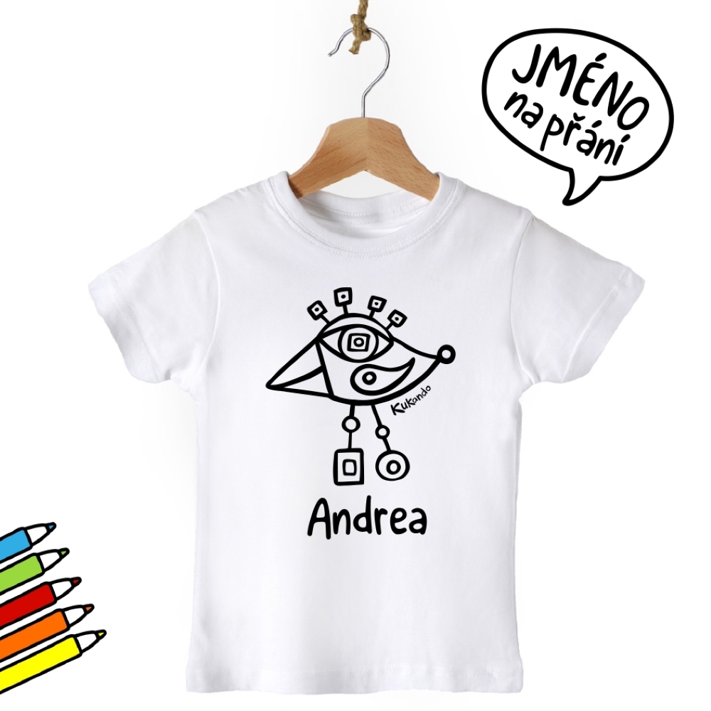 Vybarvovací dětské tričko se jménem a s motivem Kukando ptáčka – autorského obrázku, který jinde nenajdete :-) Popusťte uzdu své fantazii a udělejte z trička s pomocí fixů na textil skutečný originál!