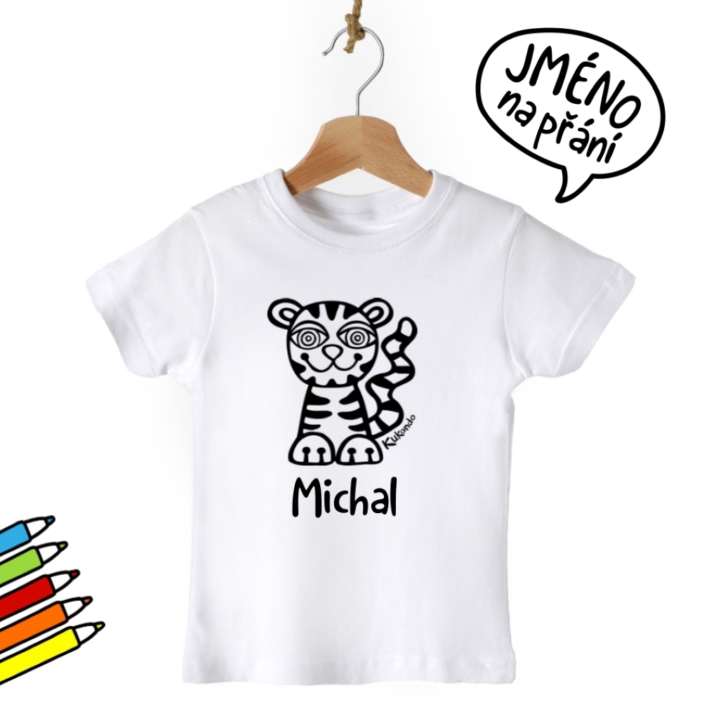 Vybarvovací dětské tričko se jménem a s motivem Kukando tygra – autorského obrázku, který jinde nenajdete :-) Popusťte uzdu své fantazii a udělejte z trička s pomocí fixů na textil skutečný originál!