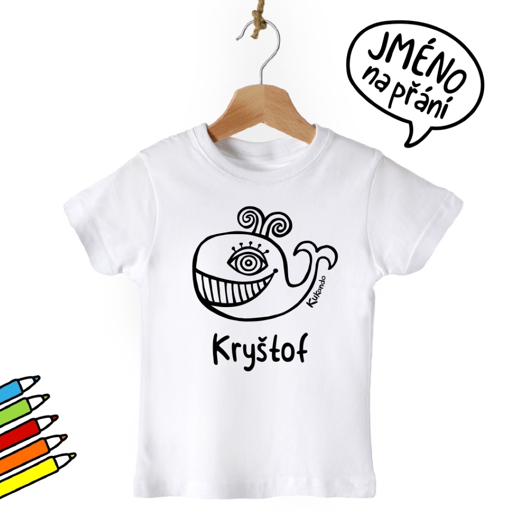 Vybarvovací dětské tričko se jménem a s motivem Kukando velryby – autorského obrázku, který jinde nenajdete :-) Popusťte uzdu své fantazii a udělejte z trička s pomocí fixů na textil skutečný originál!