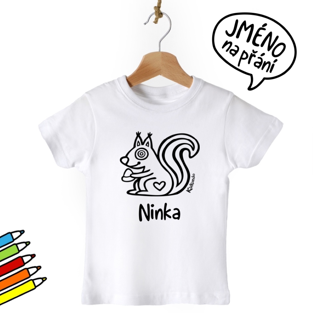 Vybarvovací dětské tričko se jménem a s motivem Kukando veverky – autorského obrázku, který jinde nenajdete :-) Popusťte uzdu své fantazii a udělejte z trička s pomocí fixů na textil skutečný originál!