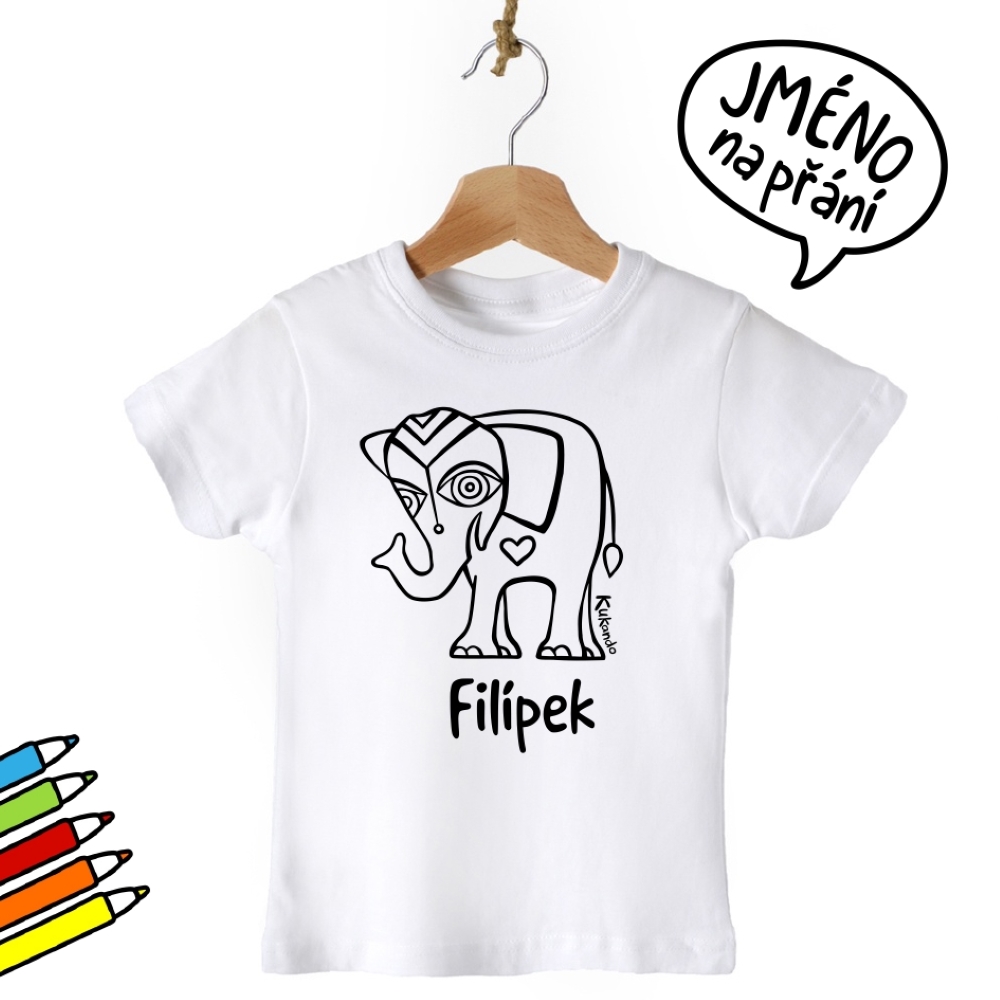 Vybarvovací dětské tričko se jménem a s motivem Kukando slona – autorského obrázku, který jinde nenajdete :-) Popusťte uzdu své fantazii a udělejte z trička s pomocí fixů na textil skutečný originál!