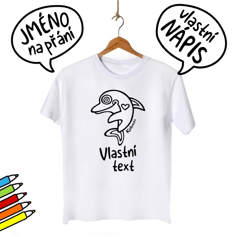 Veselé pánské tričko s textem na přání a s potiskem Kukando delfína – autorského obrázku, který jinde nenajdete :-) Popusťte uzdu své fantazii a udělejte z trička s pomocí fixů na textil skutečný originál!