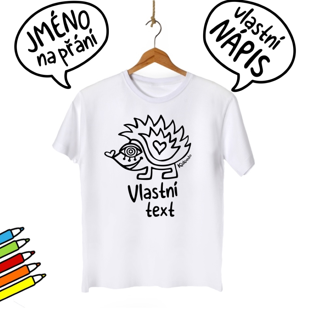 Veselé pánské tričko s textem na přání a s potiskem Kukando ježka – autorského obrázku, který jinde nenajdete :-) Popusťte uzdu své fantazii a udělejte z trička s pomocí fixů na textil skutečný originál!