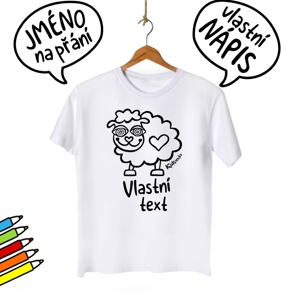 Veselé pánské tričko s textem na přání a s potiskem Kukando ovečky – autorského obrázku, který jinde nenajdete :-) Popusťte uzdu své fantazii a udělejte z trička s pomocí fixů na textil skutečný originál!